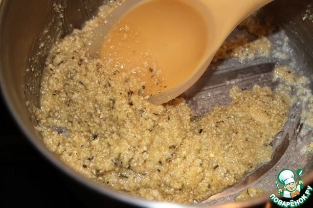 Можно заняться соусом. Для этого растопила сливочное масло (не давать ему пениться), всыпала смесь итальянских трав, орехи, все хорошо перемешала и затем, при постоянном помешивании добавляла пармезан небольшими порциями, чтобы не сбивался в комок. Огонь должен быть минимальный.
