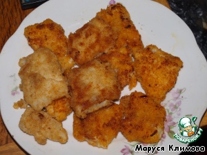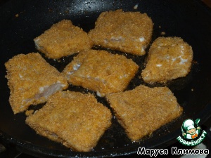 После описанных манипуляций кусочки рыбы в панировке отправляем на разогретую сковородку с приличным количеством растительного масла.