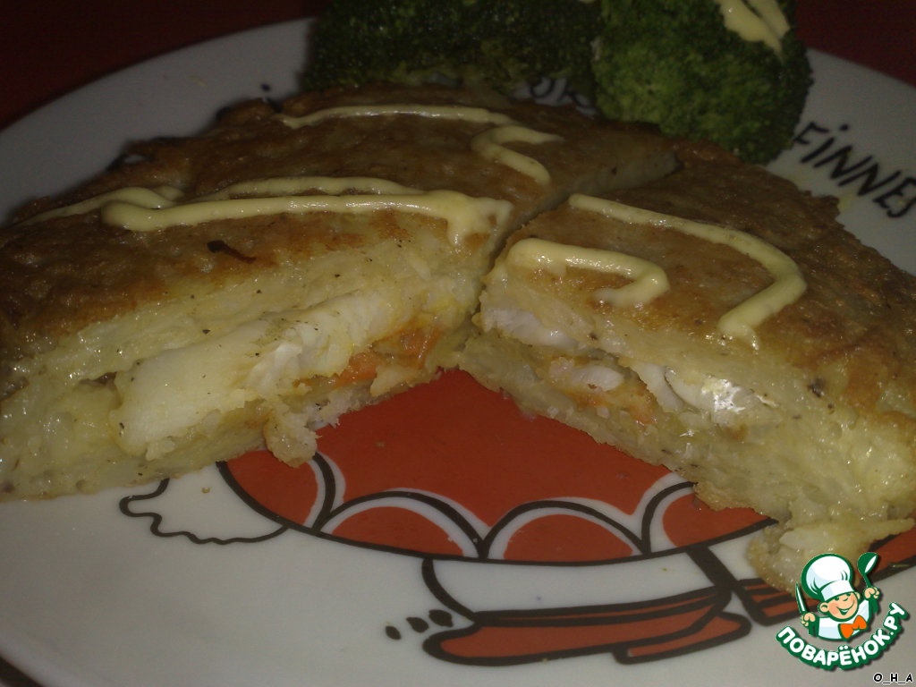 4. На разогретую сковороду (с маргарином) выкладываем ложкой картофельный фарш (слоем в 0. 5 см). Придаeм ему желаемую форму в зависимости от формы и размера Ваших кусочков рыбы, но, чтобы этот "драник" был чуть больше по площади.