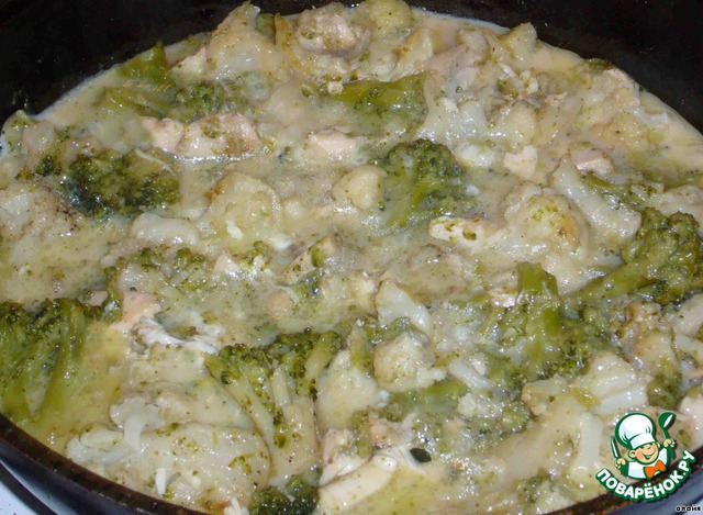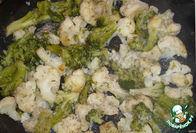 Затем добавляем брокколи и цветную капусту и обжариваем до готовности (солим и перчим по вкусу).