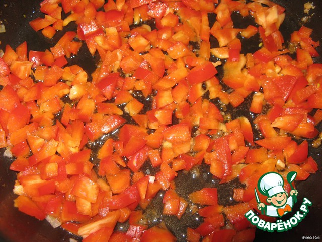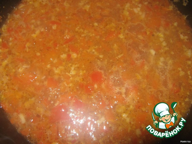 Добавляем на сковородку к перцу. Сюда же кладем томатную пасту, даем покипеть и добавляем гранатовый сок.