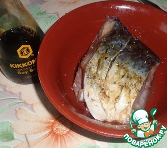 Стейки карпа промыть под проточной водой из-под крана. Затем рыбу солим и перчим по вкусу. Посыпаем розмарином. Поливаем рыбу лимонным соком. Добавляем к рыбе соевый соус. Хорошо перемешиваем. Оставляем рыбу в холодильнике на 30-60 минут.
