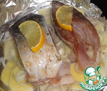 Поверх картофеля и лука выкладываем рыбу. На рыбу кладем ломтики лимона. Рыбу заворачивать в фольгу Не нужно. Ставим рыбу в разогретую духовку и выпекаем до готовности около 30 минут.