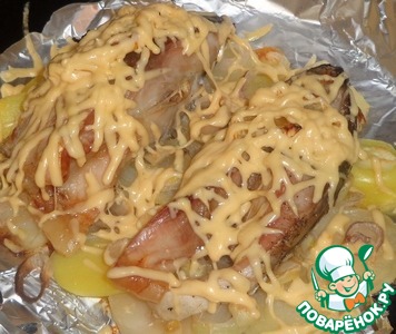 Готовую рыбу посыпаем тертым рыбой и ставим в духовку, чтобы сыр расплавился и приобрел золотистый цвет.