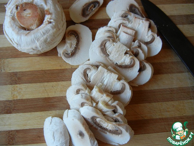 Пока наша рыбка маринуется, у нас есть свободное время. Нарезаем шампиньоны и мелко рубим зелень петрушки.