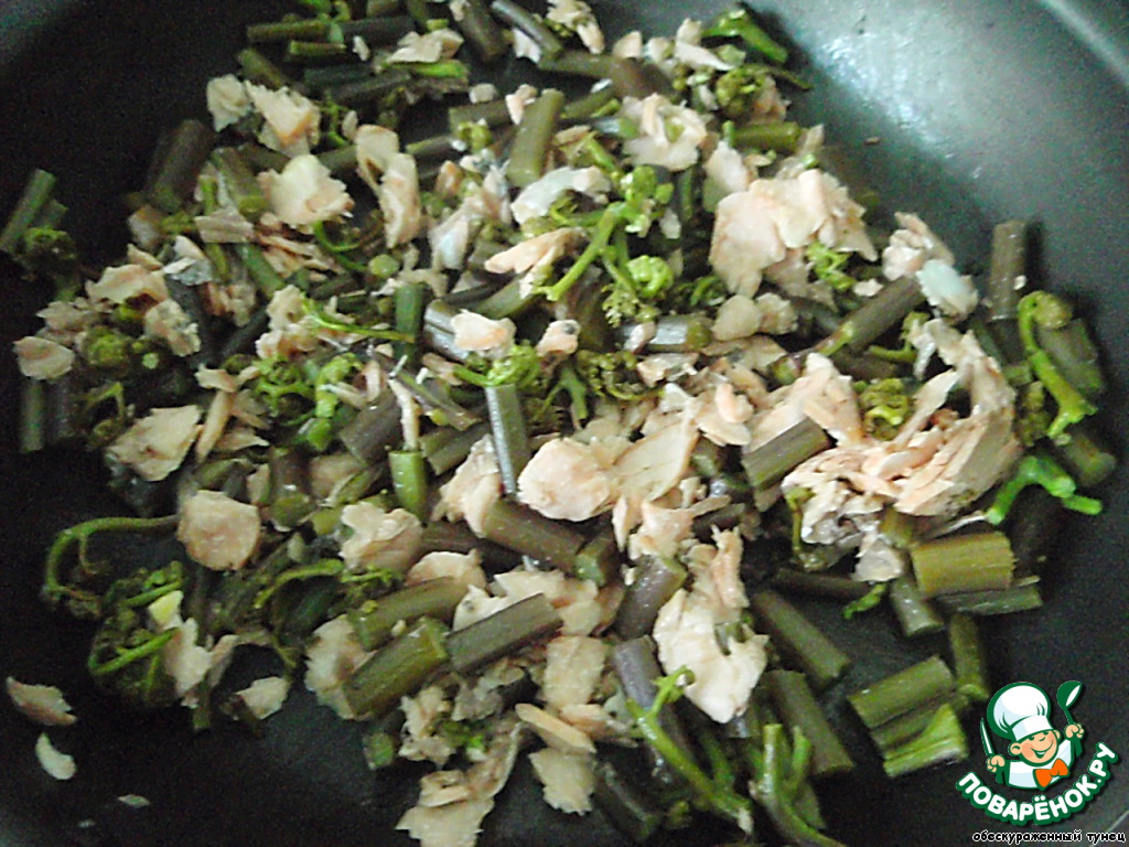 Отправляем папоротник в разогретую с маслом сковороду. Спустя пару минут кидаем туда рыбу.