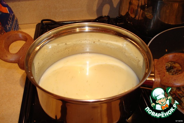 Вода,бульонный кубик и молоко. Все должно закипеть.