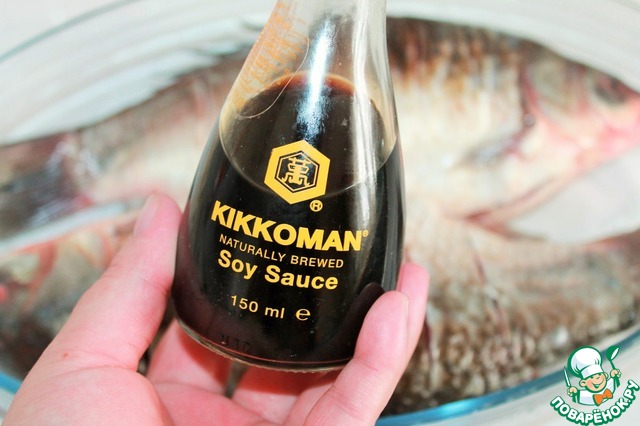 Затем поливаем соевым соусом Kikkoman по 2 ст. л. на каждого карася.