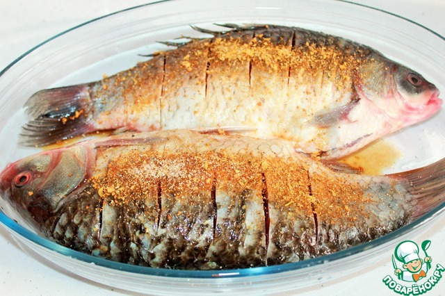 Посыпаем приправами. При необходимости добавляем соль. Тщательно натираем карасей, несколько раз переворачиваем и оставляем на 30 - 60 мин.