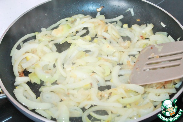 Лук нарезаем полукольцами и обжариваем на растительном масле.