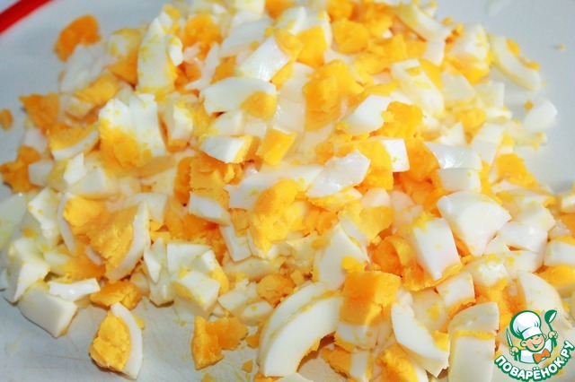 Яйцо варим, очищаем и нарезаем кубиком.