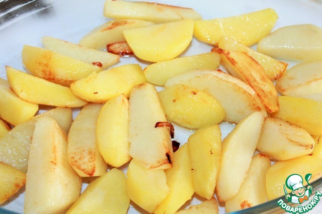 Далее я использовала на гарнир картофель, поэтому картофель очистила и разрезала вдоль на кусочки и обжарила до полуготовности. Выложила в жаропрочную форму.
