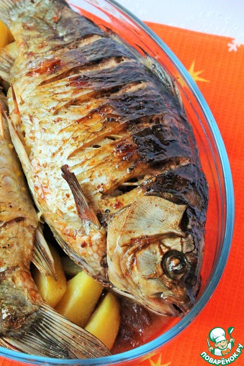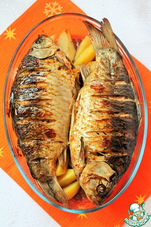 Сверху выкладываем карасей. Отправляем в разогретую до 190 гр. духовку на 30 - 40 мин. Если кожа карасей начнет трескаться, вздуваться или сохнуть силиконовой кисточкой смазываем карасей растительным маслом.