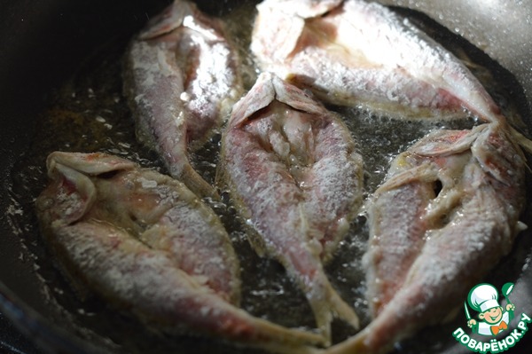 1. Рыбу почистить, разрезать вдоль спины и раскрыть как книжку. Хорошо обсушить бумажными полотенцами, посолить-поперчить, обвалять в муке.