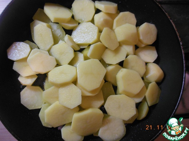 Картошку почистить, нарезать кружочками и жарить на сковороде с добавлением подсолнечного масла.