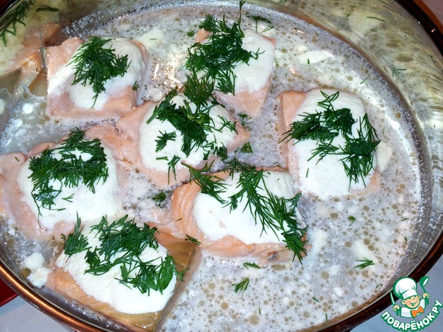 Рыба варилась, парилась в сковороде 12 минут на маленьком огне и лосось готов. Верх посыпала измельчённым укропом.