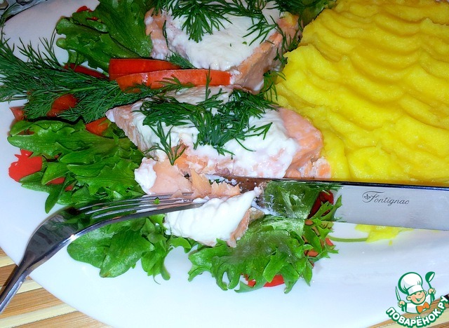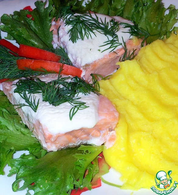 Лосось очень вкусный с картофельным пюре. Который, как обычно я варила на воде, потом воду вылили и залила картофель кипячёным, горячим молоком. В пюре добавила сливочное масло и 1/4 ч. л куркумы.