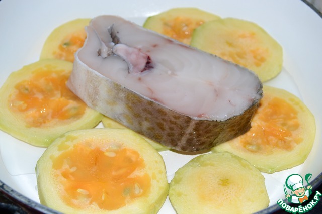Выложить кабачок на сковороду с растительным маслом. Сверху положить кусок рыбы и полить его лимонным соком. Можно взять и больше рыбы, сколько позволит сковорода, только тогда и количество овощей надо увеличить.