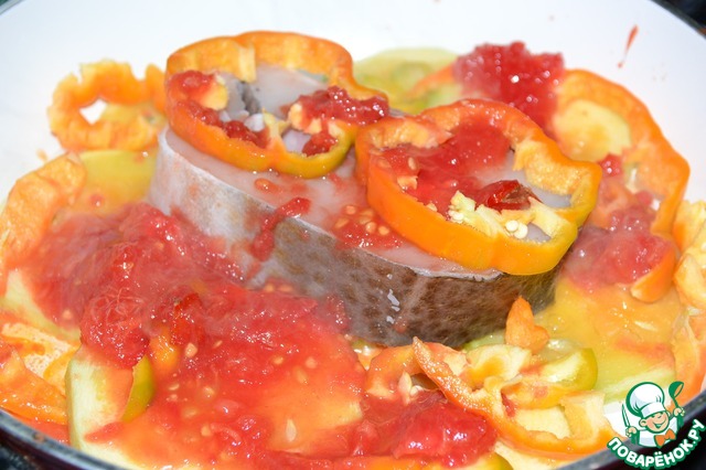 Помидоры обдать кипятком, снять шкурку и мелко-мелко нарезать. Перец нарезать кружками. Помидор и перец выложить в сковороду на кабачок и рыбу.