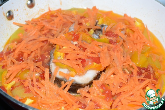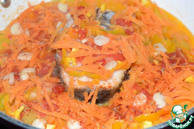 Чеснок нарезать кружками и также добавить в сковороду. Посыпать рыбу и овощи зирой и паприкой. Закрыть сковороду крышкой и тушить рыбу с овощами в собственном соку.