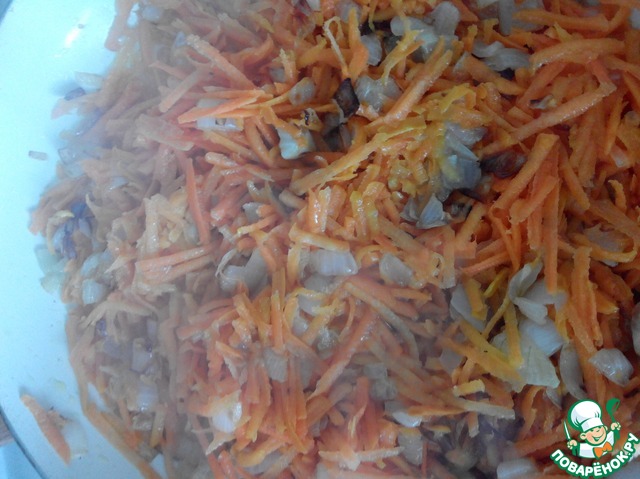 Обжарить до полуготовности, добавить крупно натертую морковь и тушить до готовности