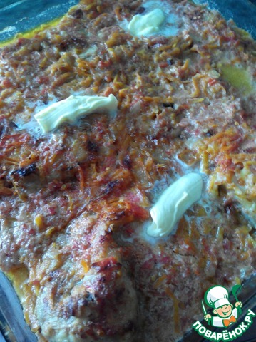 За пять минут до конца жарки сверху кладем кусочки сливочного масла