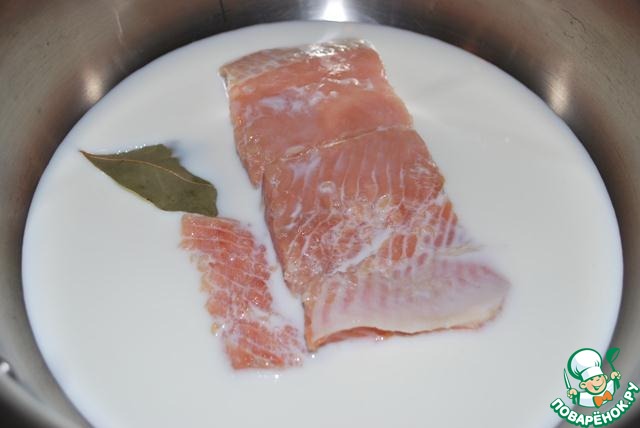 В это время займемся лососем. Подготовленный кусочек без кожи и костей отвариваем в молоке с лавровым листом около 5 минут и еще столько же настаиваем.
