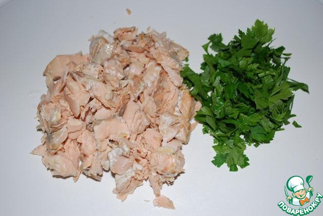 Затем остужаем и разбираем на небольшие кусочки. Заодно порезала петрушку. Здесь, кстати, дело вкуса - мне больше нравится вариант с укропом, а муж любитель петрушки, поэтому можно пробовать на свой вкус)