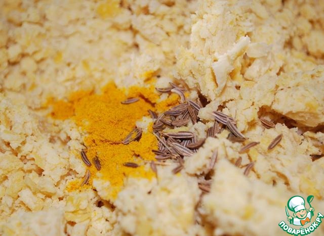 Отваренный нут разминаем в пюре. Я делаю блендером - так легче. И добавляем специи - зиру, куркуму, перец, соль, чеснок (по вкусу). Хорошо вымешиваем.