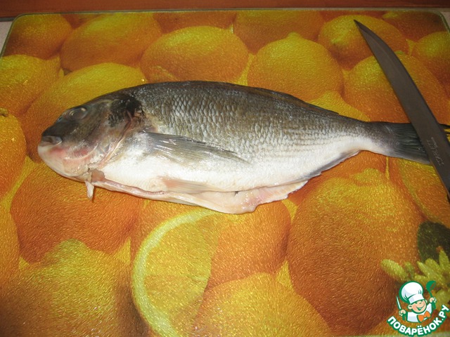 Рыбу очистить от чешуи, выпотрошить, помыть и промокнуть бумажным полотенцем. На рыбе делаем разрезы глубиной полсантиметра - для того, чтобы рыба пропеклась равномерно.