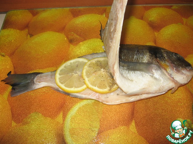 Натереть внутри и снаружи солью и перцем. Тонкие кольца лимона выкладываем на нашу рыбку.
