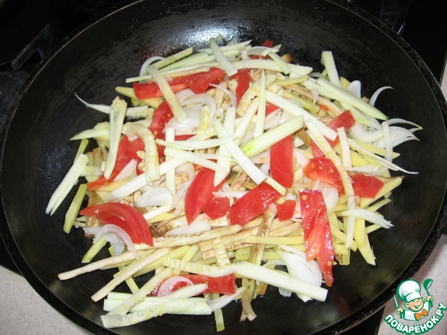 Теперь подготовим овощи. Баклажан и кабачок очищаем от кожуры и нарезаем тонкой соломкой. Помидор, лук - полукольцами. Все овощи выкладываем в хорошо разогретую сковородку с небольшим количеством оливкового масла. Обжариваем на большом огне минуты три. Добавить мелко порезанную петрушку, соль, перец.