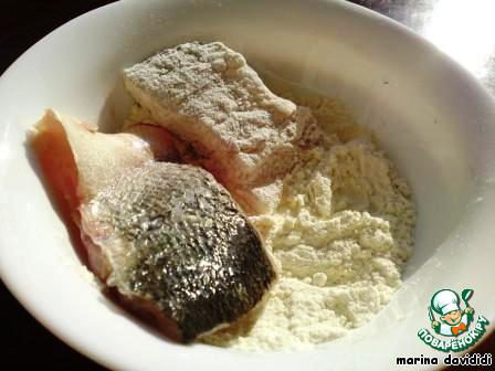 Чистим рыбу, тщательно моем, режем на порционные кусочки. Надрезаем шкурку для того, чтобы не надувалась при жарке. Окунаем каждый кусок в сок лимона, вытаскиваем и держим 10 мин., чтобы прпитался. Солим каждый кусок.