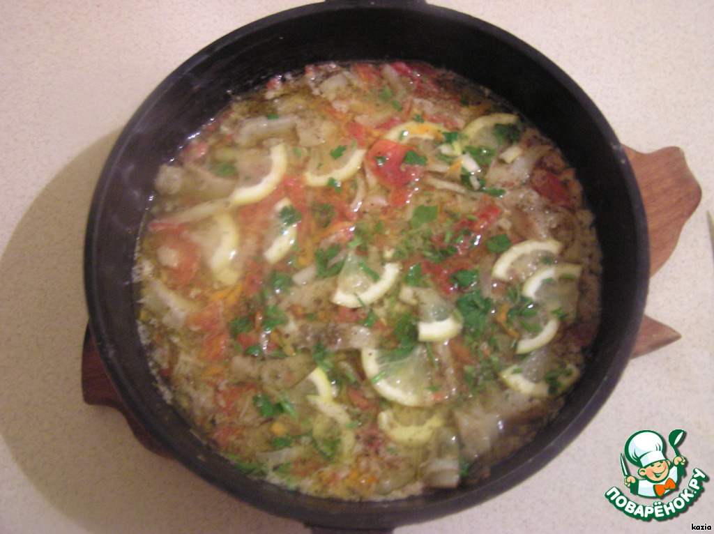 2. В большую сковороду укладываем слоями: помидоры, филе,солим перчим, лук, морковь. Опять слоями филе,солим перчим, лук, помидоры.