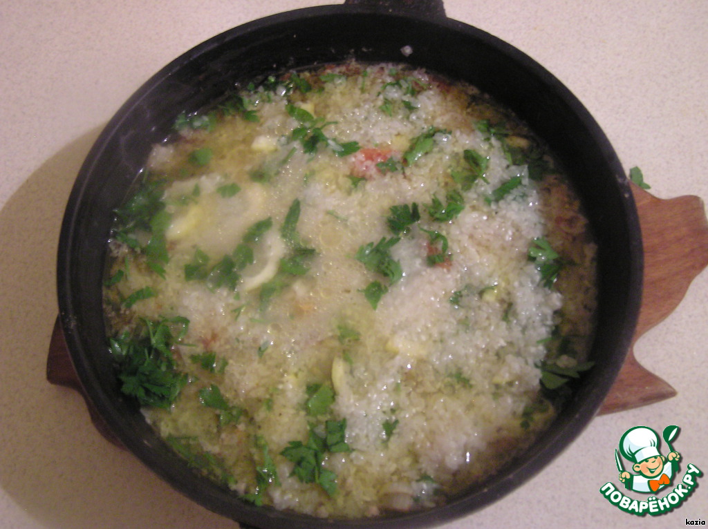 5. Рис промываем и бросаем в сковороду так, чтобы он полностью покрылся жидкостью. Опять в духовку на 10-15 мин (рис остаётся немного недоваренным). Духовку выключаем, но сковороду оставляем в ней ещё минут на 10 - рис дойдёт сам.