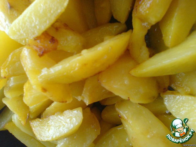 Очищенный и промытый картофель нарежем дольками и слегка обжарим на сливочном масле.