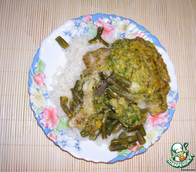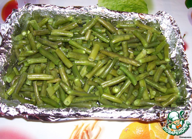 В емкость для запекания выкладываем слой предварительно размороженной стручковой фасоли, чуть солим ее (вообще, обычно я делаю эту рыбу в фольге, но в этот раз у меня оказалось ее мало совсем).