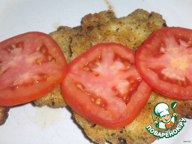 Выложить поджаренное филе на блюдо. Сверху уложить тоненькие ломтики помидорок.