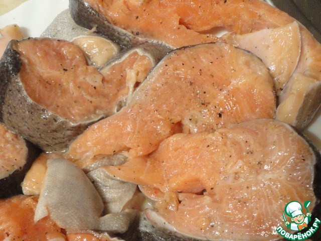 Почищенную рыбу режем кусками толщиной около 2 см. Пинцетом удаляем мелкие кости. Солим и перчим. Поливам лимонным соком и оставляем мариноваться на 15-30 минут.