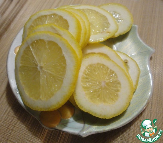 Пока маринуется рыба, нарезаем лимон. Количество кружочков должно равнятся количеству кусочков рыбы.