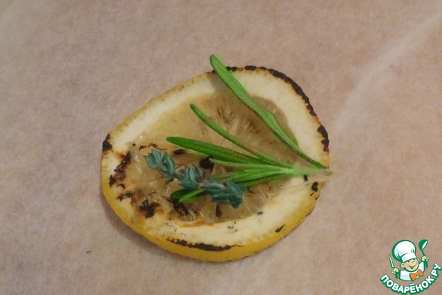 Нарезаем пергамент по количеству кусочков рыбы. Размер пергамента должен быть таков, чтобы можно было завернуть в него рыбу. На пергамент кладем лимон. Сверху кладем по кусочку веточки розмарина и тимьяна