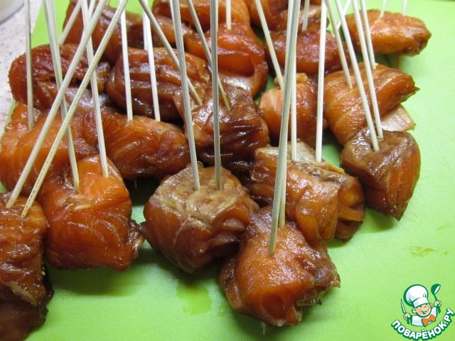 Чтобы было удобнее, куски форели я надеваю на деревянные палочки. Это делает работу с раскаленным маслом более безопасной.