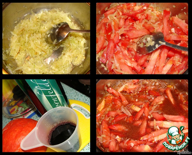 Пока обжаривается, режем помидор/помидоры средними кусочками (я делаю это на овощной терке), добавляем помидор к луку, перемешиваем и вливаем красное вино.
