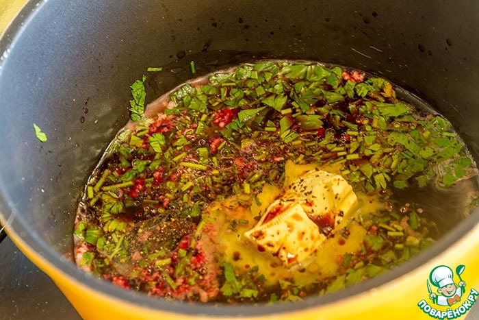 Добавить мелконарезанную петрушку, выдавить пару зубцов чеснока, добавить кусочек сливочного масла. Поперечить свежемолотым перцем.
