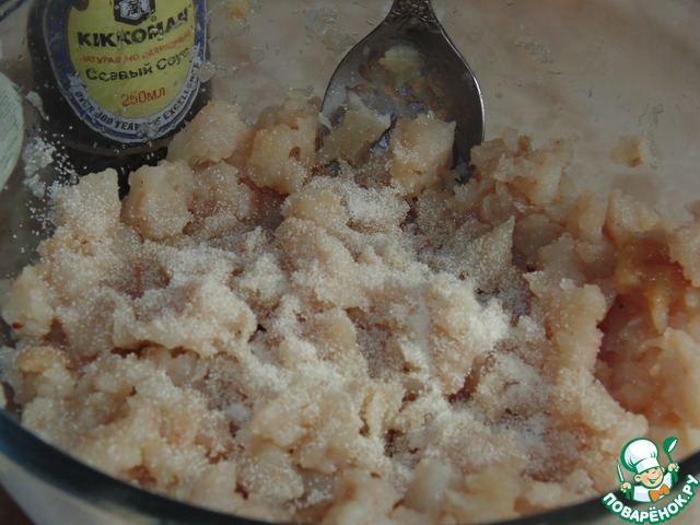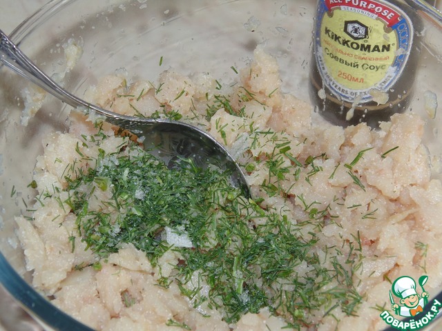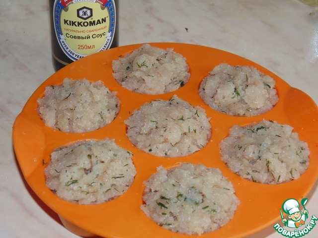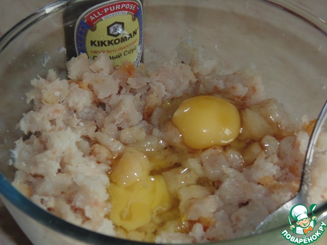 Рыбный фарш разморозить, добавить соевый соус Kikkoman и хорошенько перемешать.