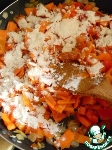 Посыпать мукой, тонкой струйкой влить бульон или воду, постоянно помешивая.
