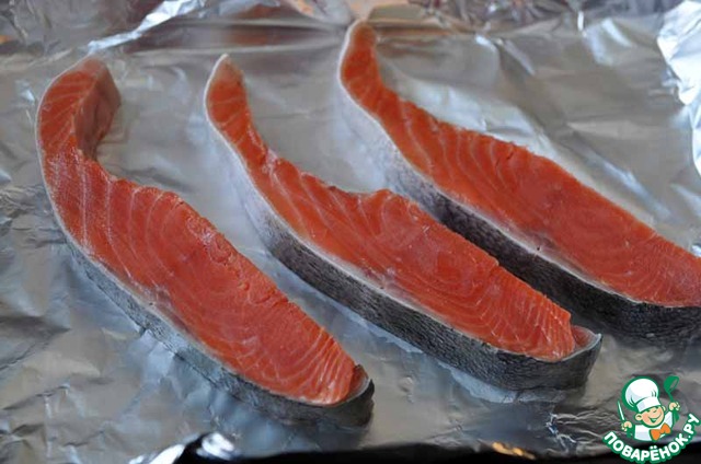 Кладём рыбу на противень (форму), покрытый фольгой.