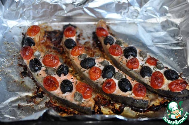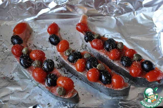 Сверху на рыбу кладём половинки помидоров черри, разрезанные пополам маслины, каперсы, посыпаем сухим тимьяном, солью, свежемолотой смесью перцев и поливаем оливковым маслом.