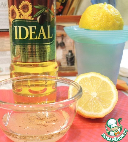 В растительное масло (идеально подходит масло "Идеал" микс подсолнечного и оливкового) добавить сок половинки лимона, соль, перец. Это маринад для рыбы.