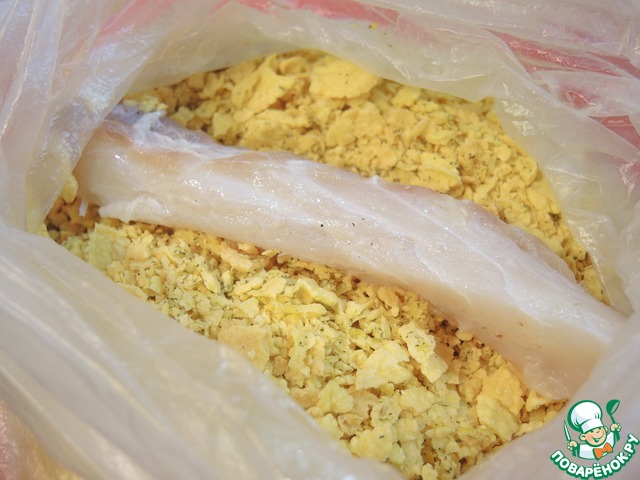 Теперь панировка: в обычный пакет насыпать кукурузные хлопья, цедру лимона и специи для рыбы. Можно добавить 1 ст. л. муки, но я этого не делала. Пакет хорошо помять рукой или скалкой, чтобы хлопья измельчить, но не сильно. Каждый кусочек класть в пакет и хорошо обваливать. В пакете это делать очень удобно, панировка распределяется равномерно.
